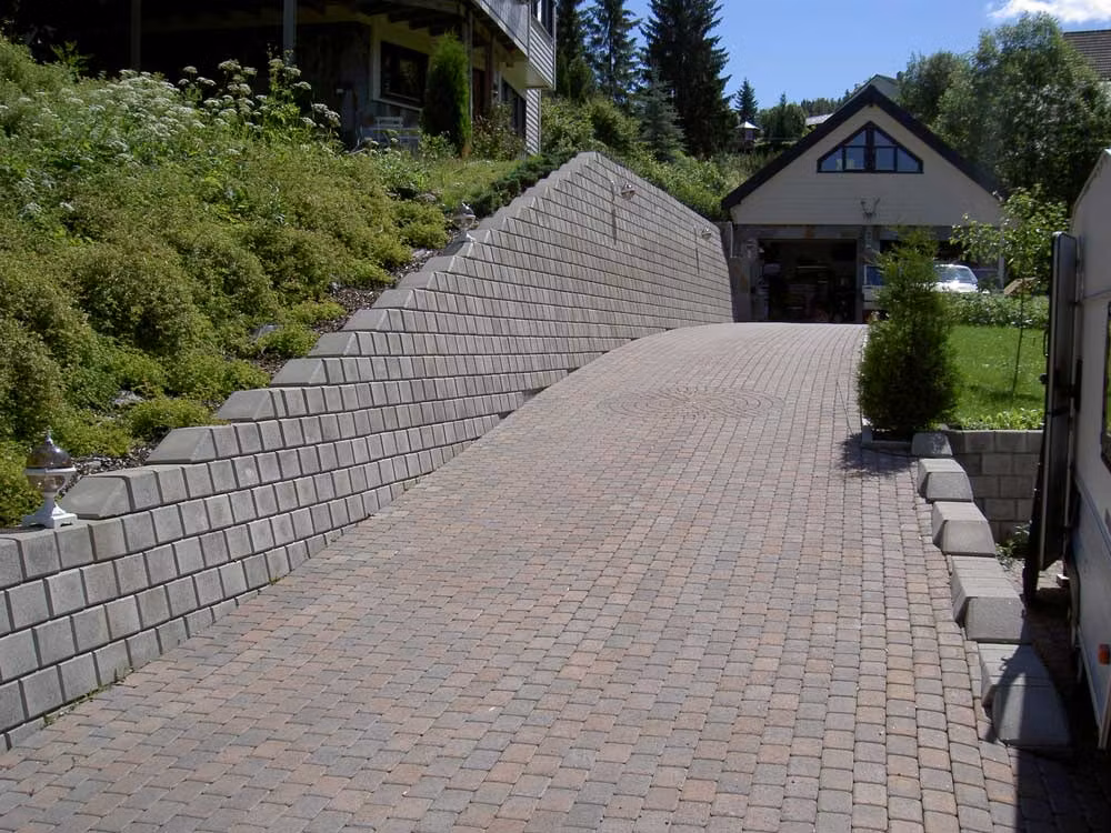 Ministøttemur heller 10 grader (3 cm pr. skift) bakover mot terrenge på vannrett såle. Vi har lagt inn låsefas i bakkant av blokkene, og sammen med høy egenstabilitet gir dette et godt utgangspunkt for en varig og stabil mur.