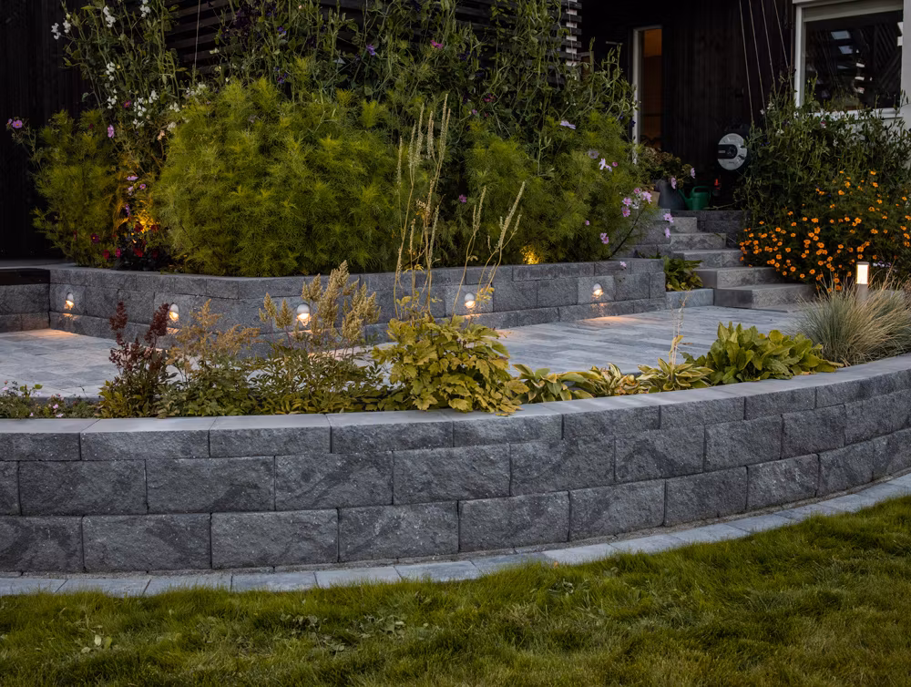 Vertica® mur er en stilren støttemur med store rektangulære blokker. Muren har en bruddfront med et naturlig uttrykk.