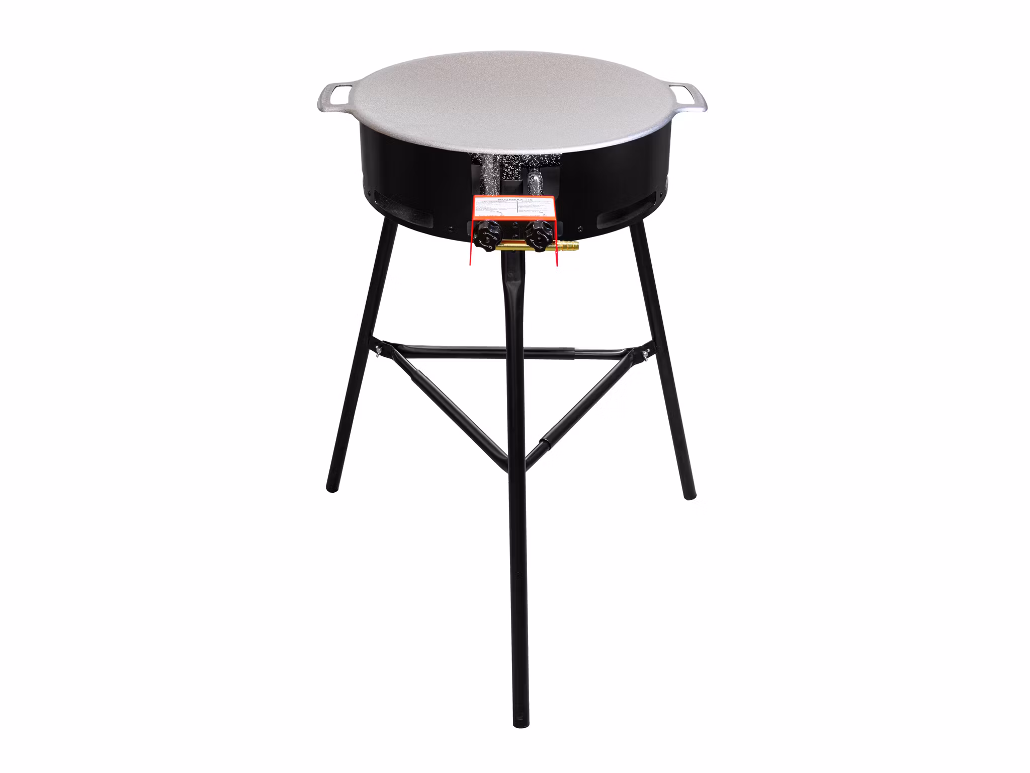 Gassbrenneren har to trinnløse justerbare brytere som styrer varmen på de to gassringene uavhengig av hverandre, noe som gjør det mulig å ha ulike temperatursoner på hellen. Effekt 7,9 kW. Varmer raskt opp stekehellen og gir jevn varme. Leveres med beskyttelsestrekk for gassbrenner og en tube med stekefett. Settet inneholder også en oppbevaringspose og tre korte ben til bruk når stekehellen benyttes over åpen ild, perfekt for utflukter.