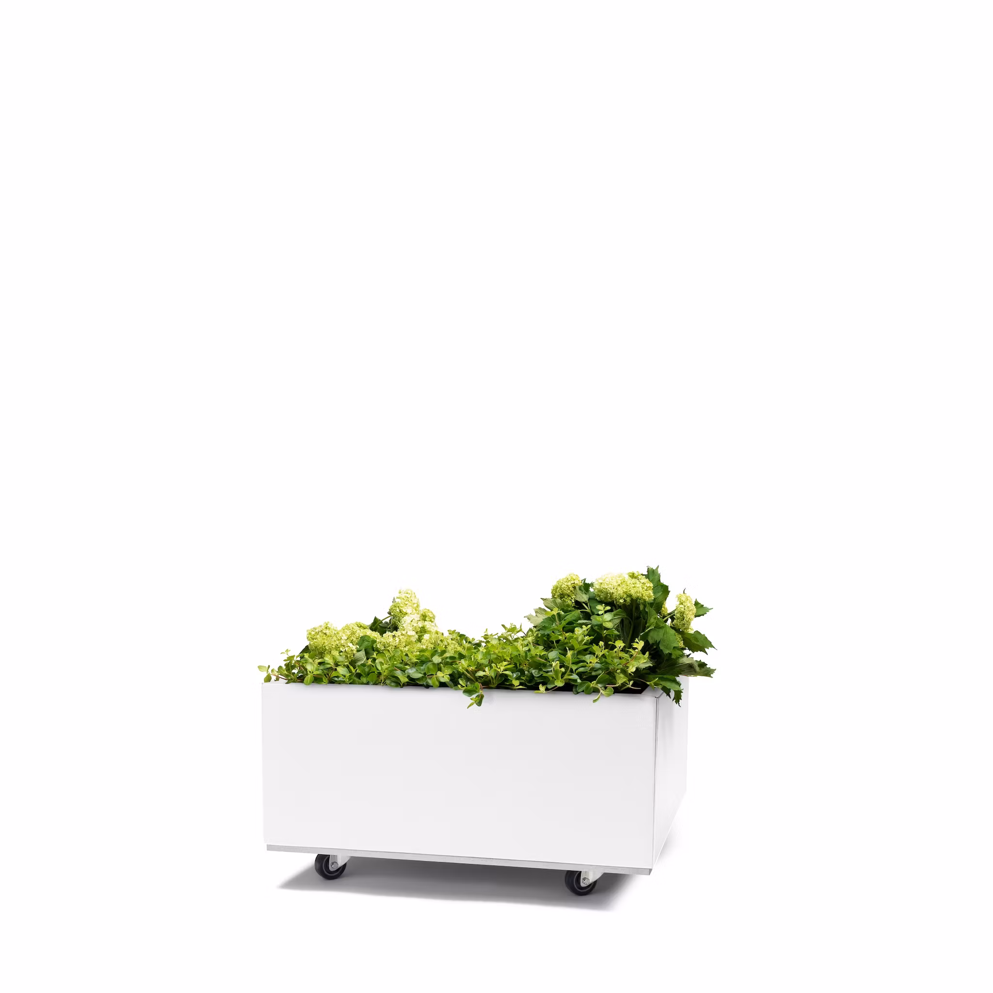 Kvadratisk kasse med drenerende bunnplate og 4 hjul eller ben.