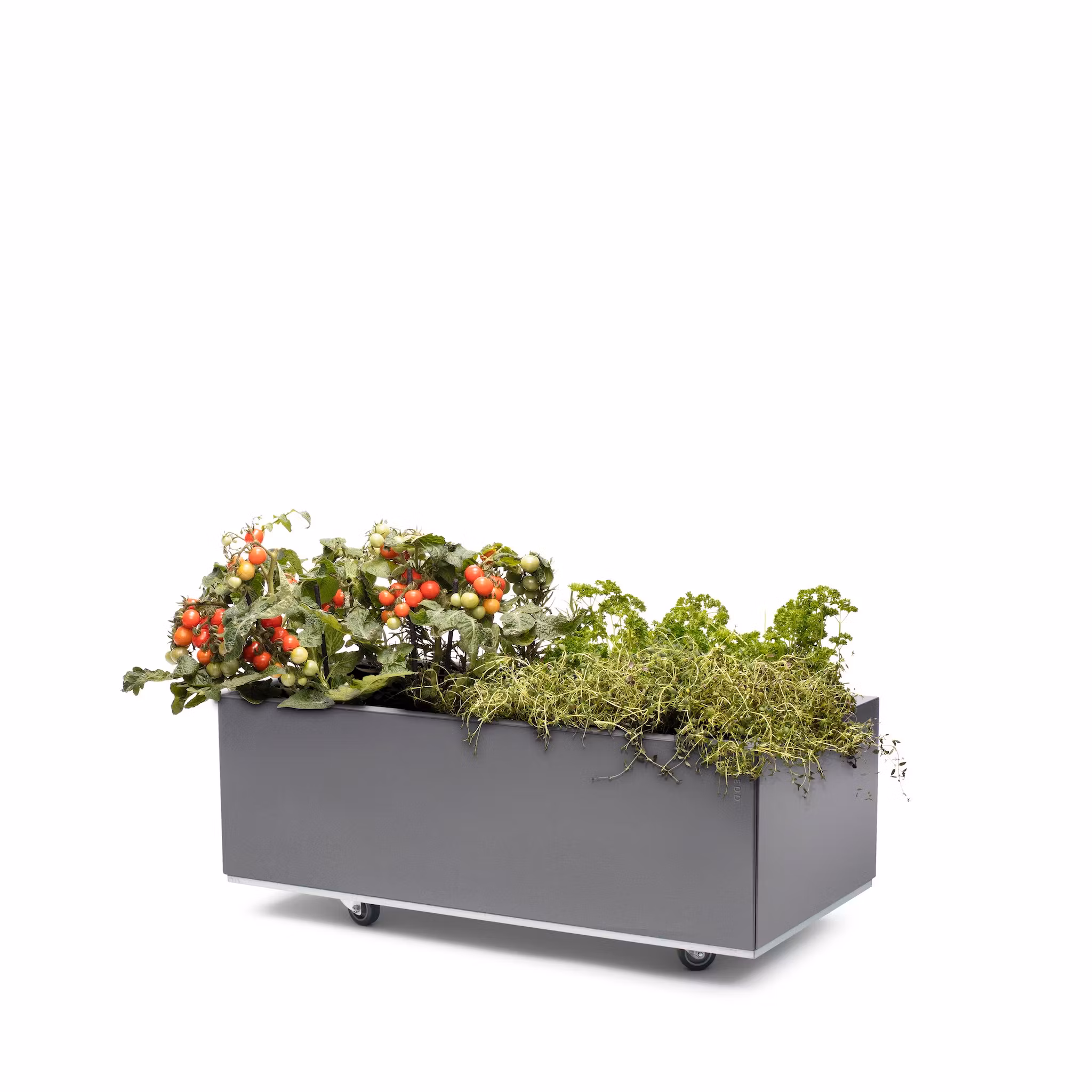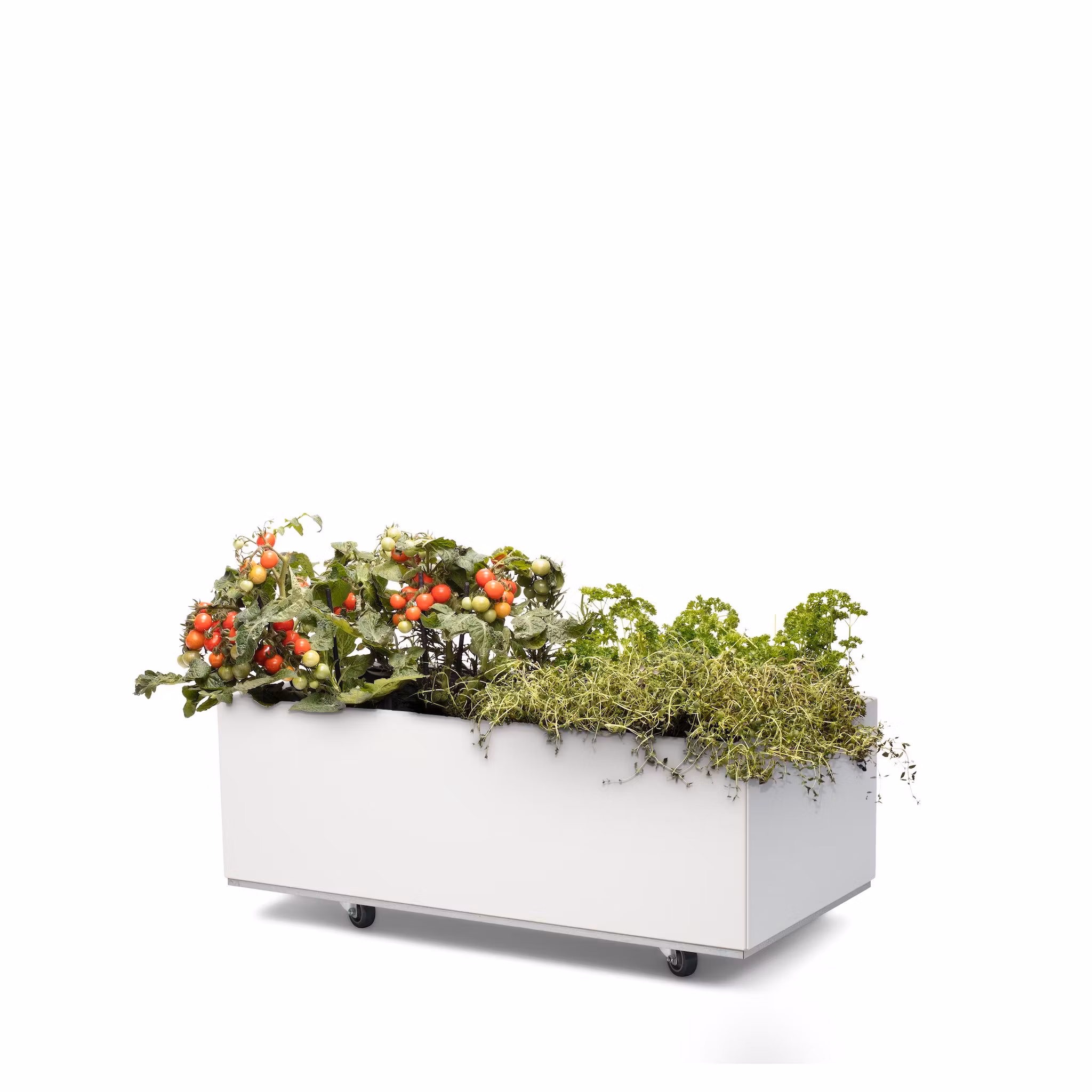 En nett, men romslig kasse med drenerende bunnplate og 4 hjul eller ben.